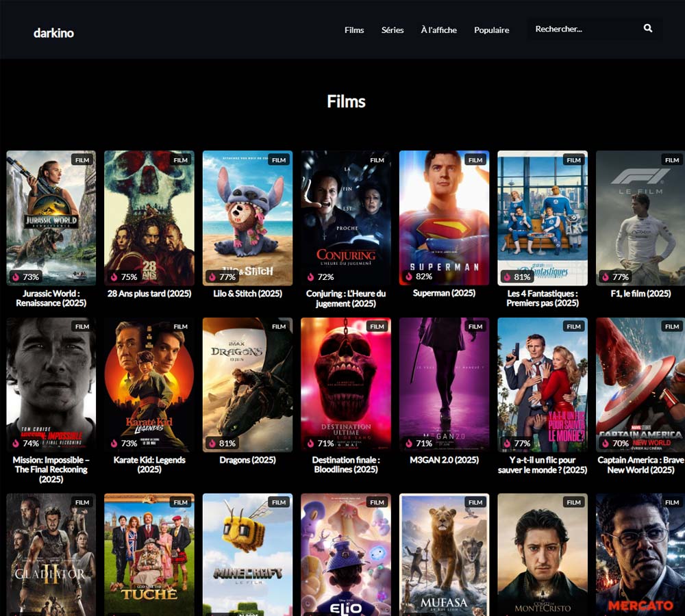 Darkino propose l’intégralité de son catalogue sans demander la moindre contribution financière aux visiteurs. Les utilisateurs accèdent immédiatement aux films récents, aux séries populaires et aux documentaires sans créer de compte ni fournir d’informations personnelles.