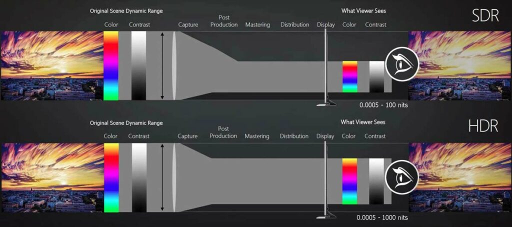 La luminosité maximale HDR fait référence à la luminance maximale pouvant être atteinte dans de petites zones localisées lors de l’affichage de contenu HDR. Cette intensité n’est généralement maintenue que pendant de brefs instants et ne s’applique qu’à des scénarios spécifiques, tels que le soleil ou les sources lumineuses dans les vidéos HDR. Bien qu’elle améliore la brillance de ces éléments pour une expérience visuelle plus authentique, cette luminosité ne peut être maintenue sur l’ensemble de l’écran ni déclenchée lors d’une utilisation quotidienne.