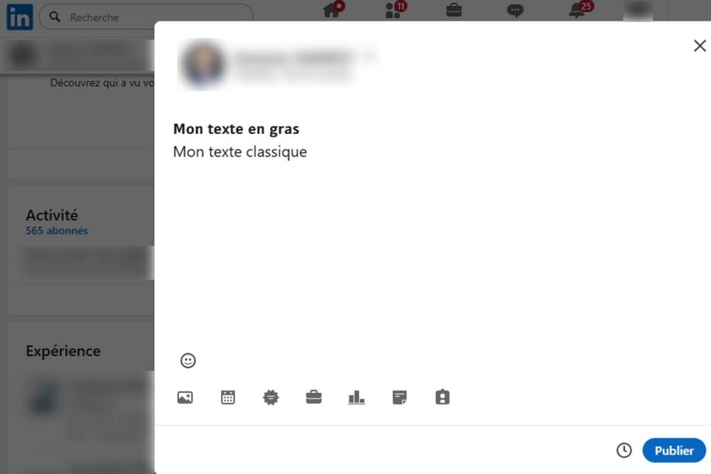 Certaines sections du profil LinkedIn acceptent un formatage limité grâce aux caractères Unicode. Le titre professionnel, la section “À propos” et les descriptions d’expériences peuvent afficher du texte en gras généré par des outils externes.